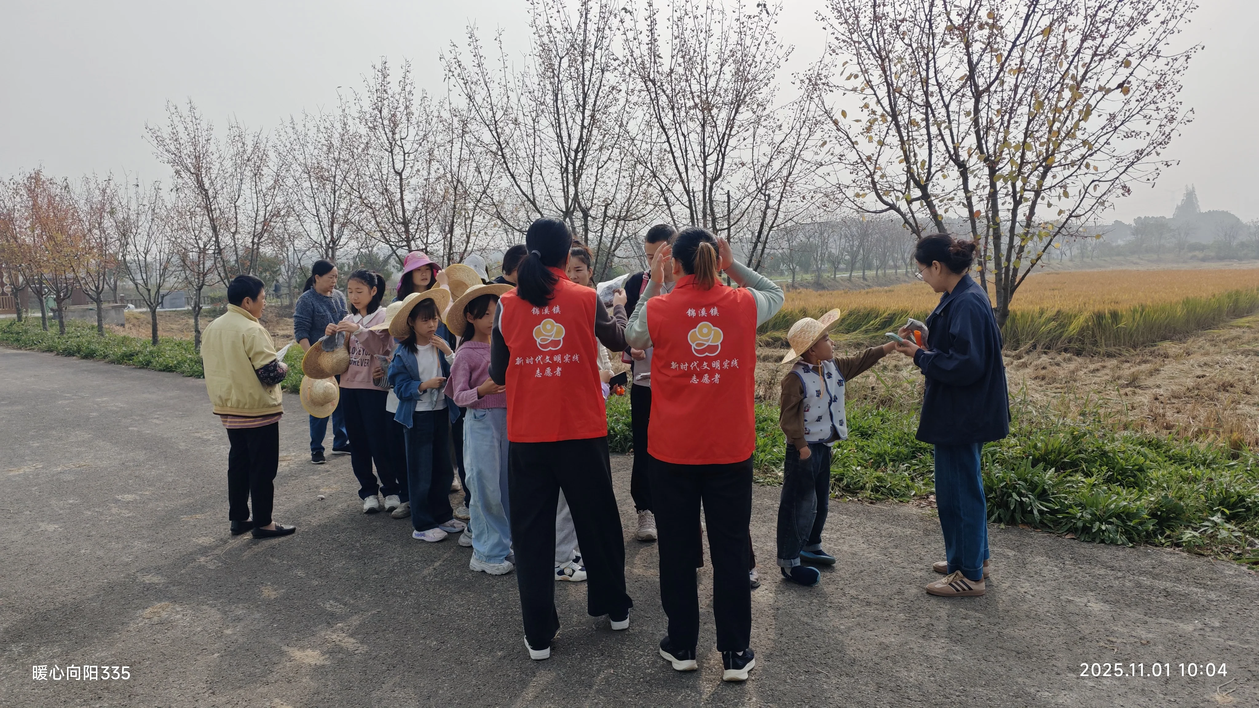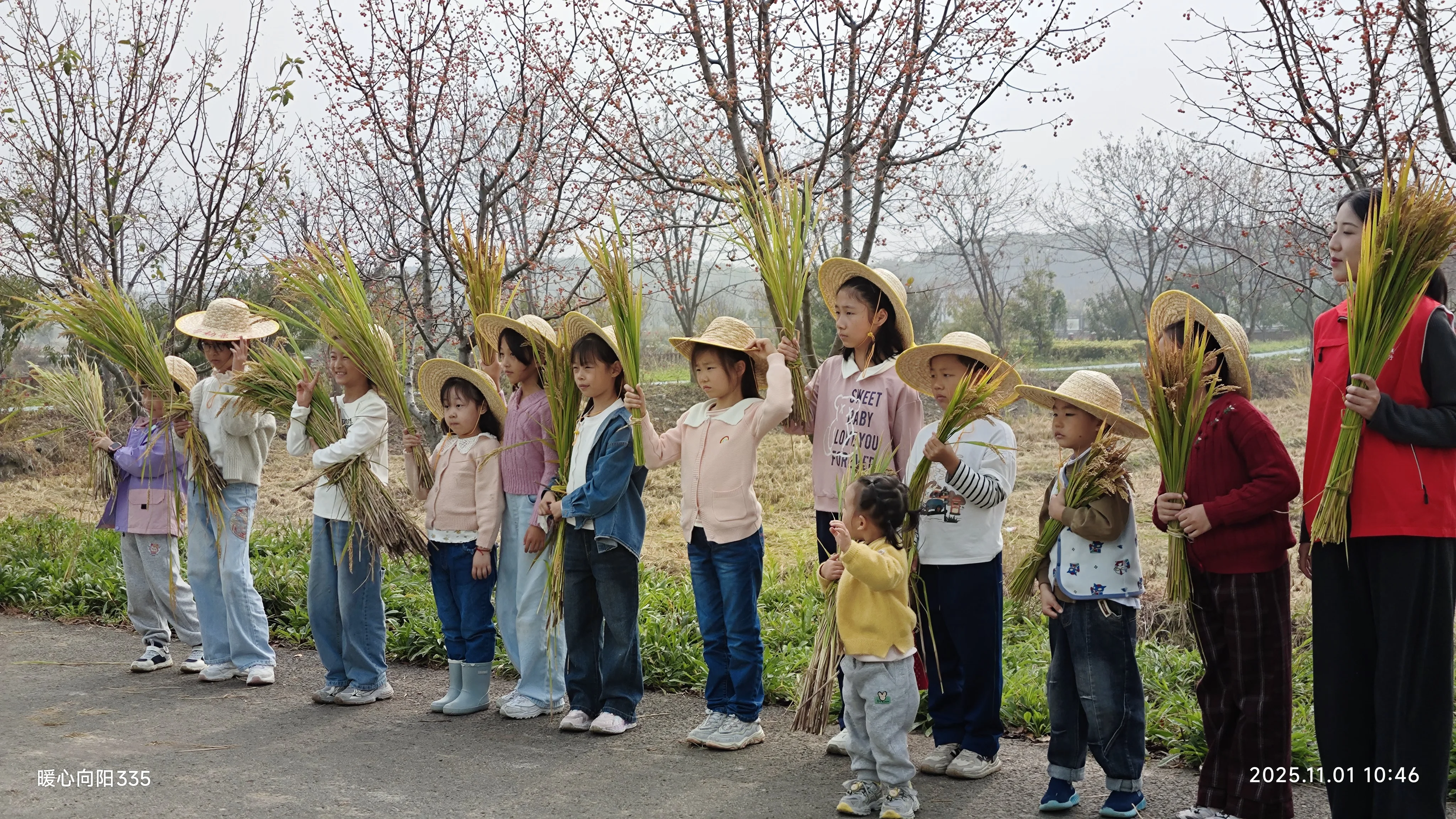 小朋友们在家长和志愿者的看护下体验割水稻